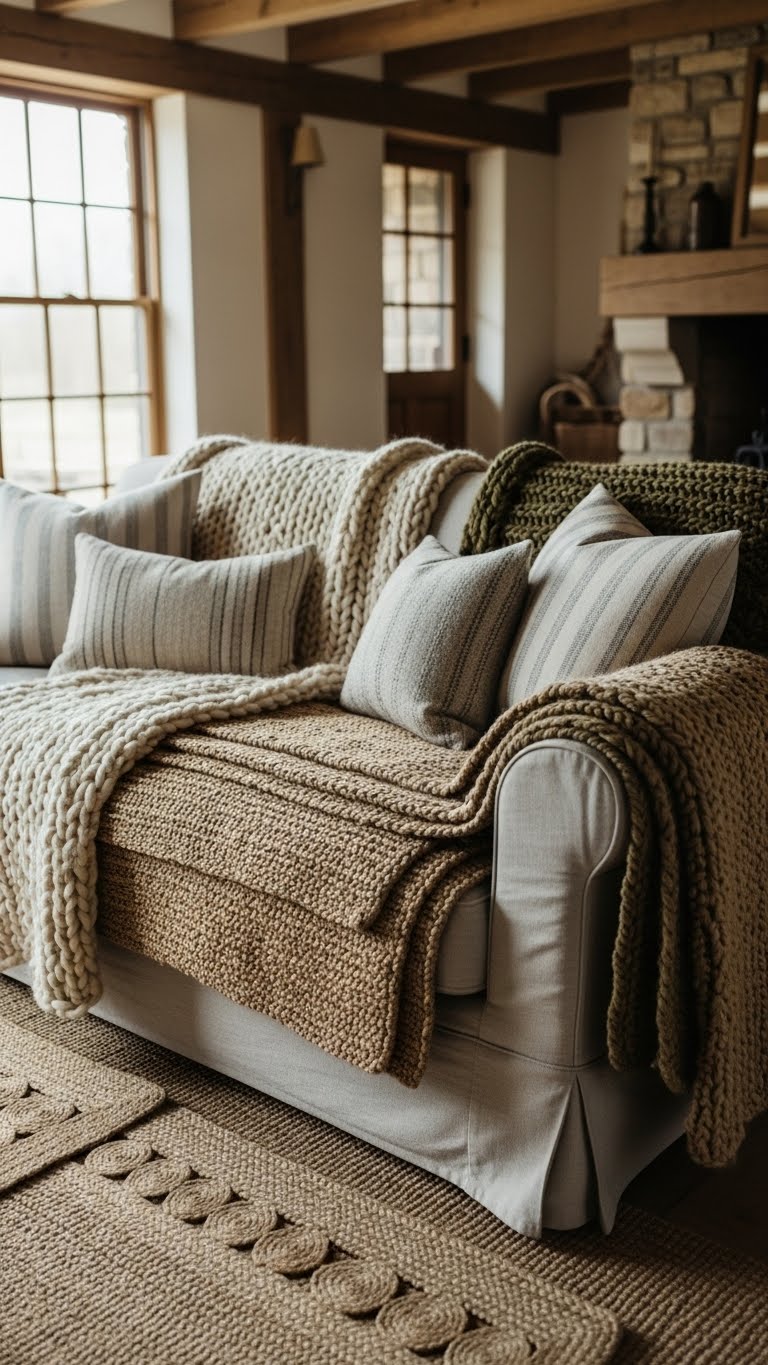 Stack rugs and throws for extra warmth. Find a jute rug online for $20. Layer it over an old carpet. Add a wool throw from a sale rack. Drape it casually over your couch. Break it down: Start with the base rug. Pile on pillows in different fabrics. This adds depth without effort. For a DIY idea, knit a simple cover with yarn from home. Use what you have to mix textures. Your space will feel snug in minutes. Try this: Fold blankets at the foot of your bed for easy access. It’s a quick way to cozy up.