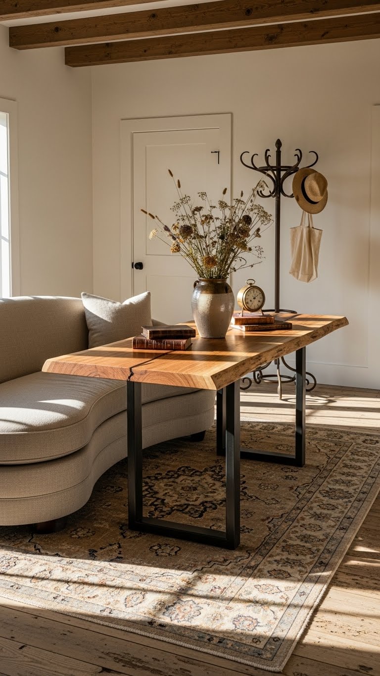 Bring in a curved sofa or live-edge table for soft shapes. Look for second-hand pieces under $100. Place it where it stands out. Arrange with pillows for comfort. Keep it simple: Measure your space first. Position the furniture to flow naturally. This softens sharp corners. For a DIY upgrade, sand and oil an old table yourself. Use supplies from the hardware store. Your room gets a modern twist. Try this: Add a lamp on top for balance. It’s an affordable way to update.