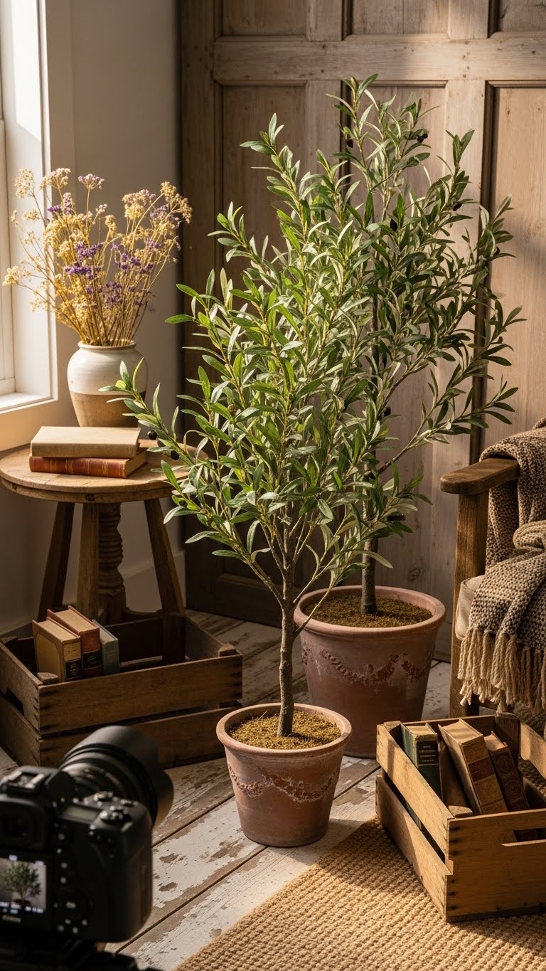 Pick faux olive trees for easy greenery. Buy one for $20. Put it in a simple pot. Dust regularly to keep it fresh. This saves time on care. For DIY, add fake vines to real pots. Your space stays green year-round.