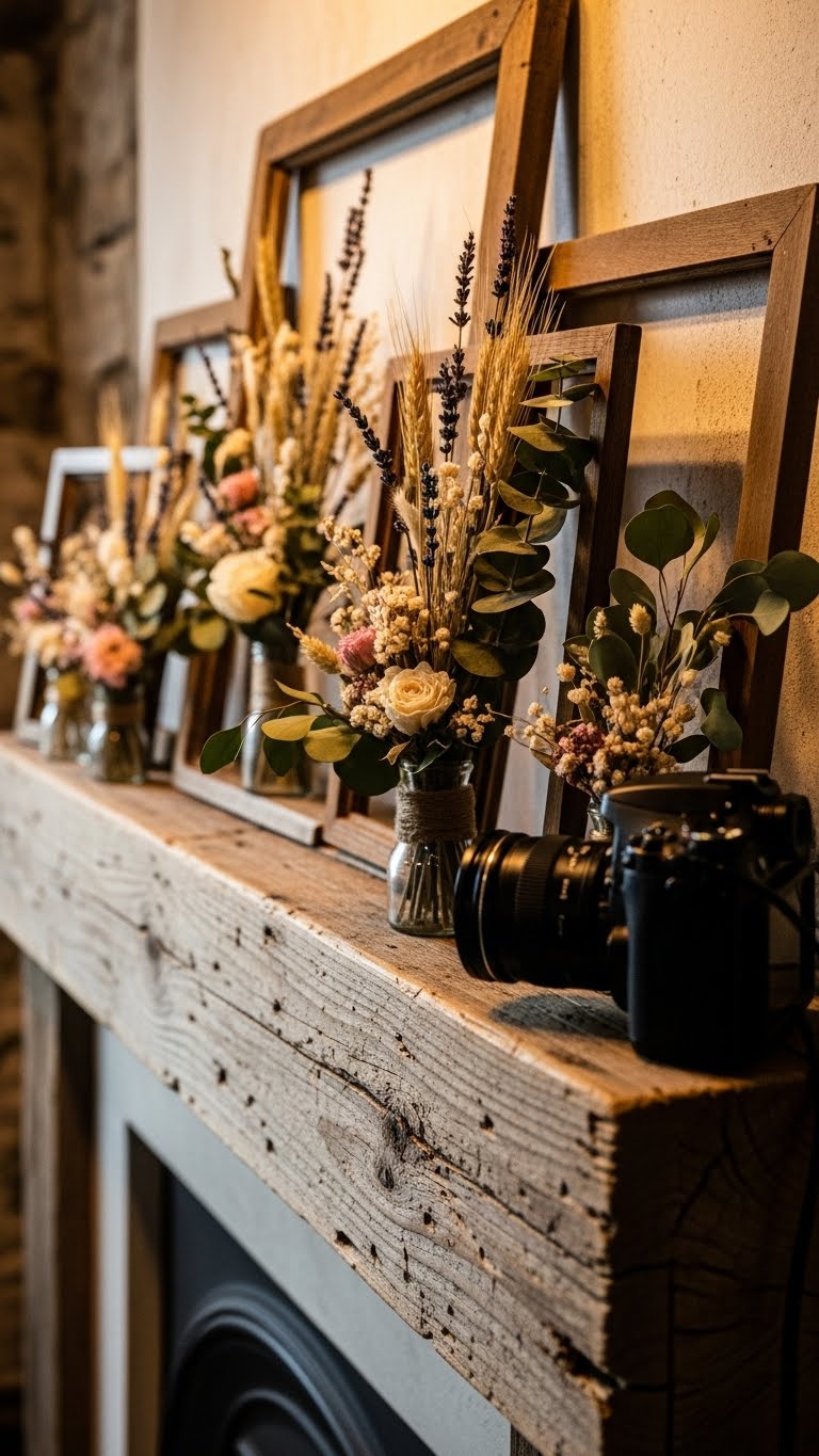 Use dried flowers and frames on your mantel. Gather from nature or buy cheap. Arrange in a line. This updates the space fast. For DIY, tie flowers with string. Change them with the seasons.