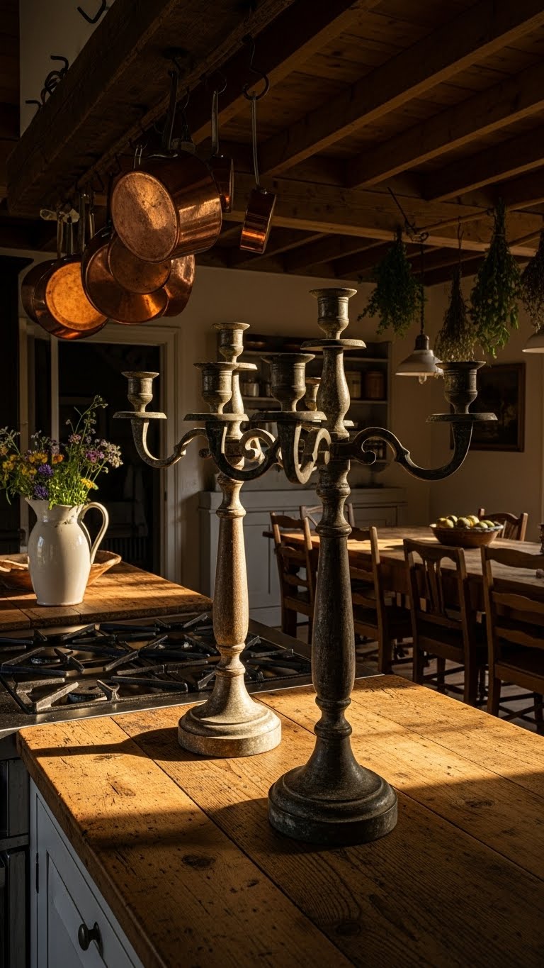 Display candelabras from thrifts. Place on counters. Light candles for glow. This brings history in. For DIY, polish gently.
