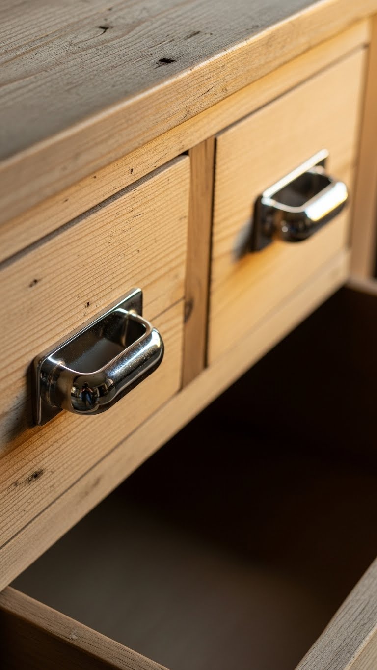 Swap handles for chrome ones. Buy a set for $5. Screw them on easily. This adds shine. For DIY, clean existing ones.