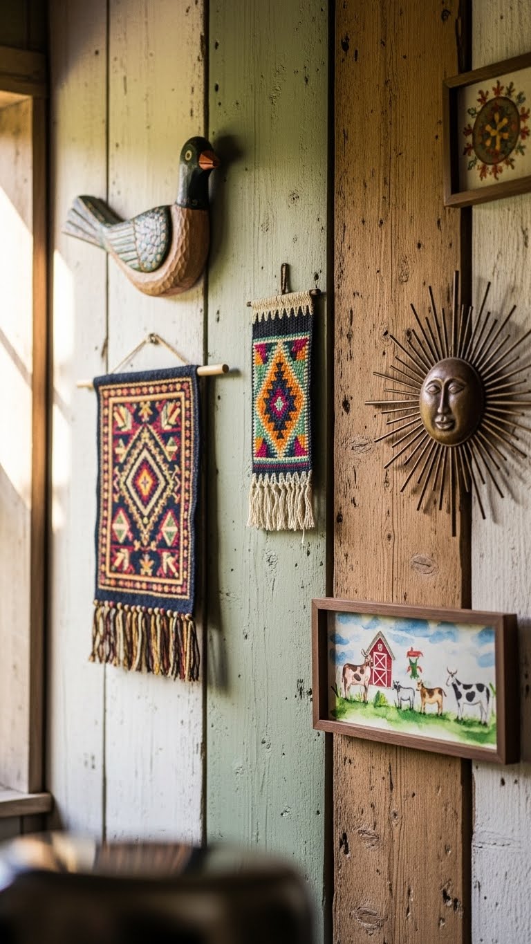 Find real folk art at markets. Hang on walls. This adds soul. For DIY, frame prints.
