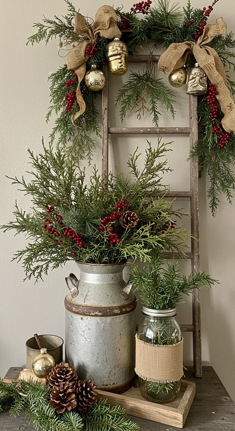 Although you might picture sprawling wreaths and perfect boughs, a vintage farmhouse evergreen display feels intentionally simple and well-loved: tuck faded cedar and pine sprigs into a weathered milk can, layer burlap ribbon around a mason jar filled with clippings, and lean a small, slightly worn ladder against the wall to hold swags and garlands.