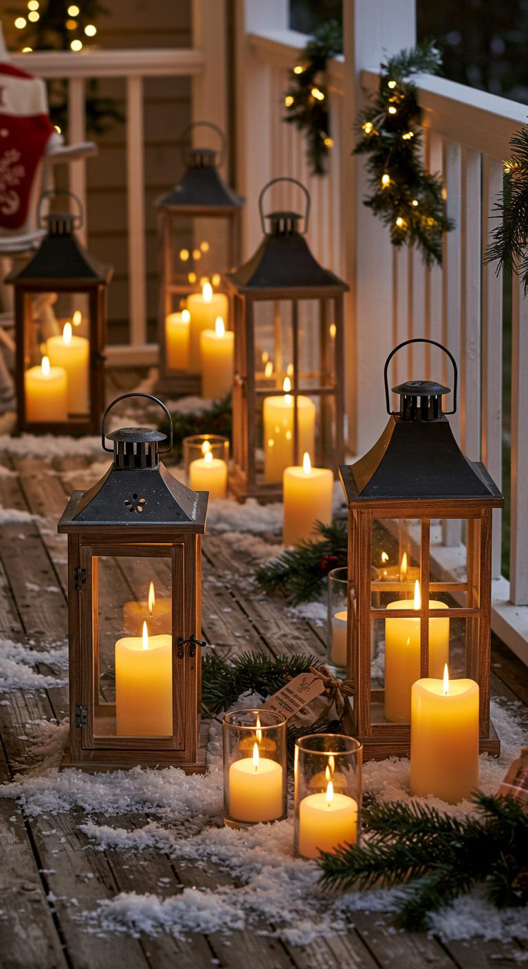 A line of glowing lanterns along your porch steps instantly turns the entry into a welcoming, candlelit pathway—soft amber light pooling on worn wood and dustings of faux snow.