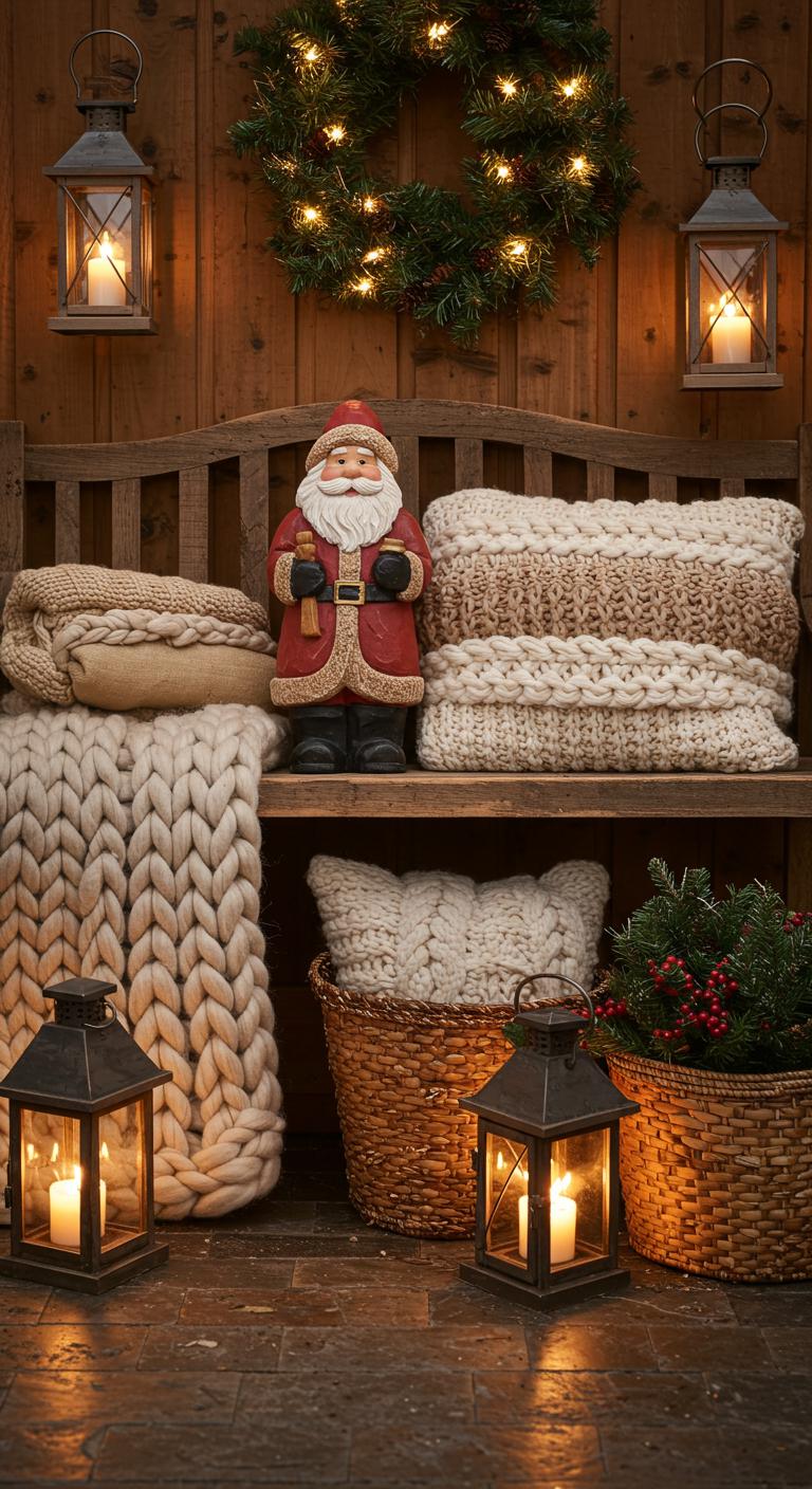 After your lanterns set the mood, bring that same cozy glow closer to the door with a rustic Santa bench dressed in chunky knit throws.