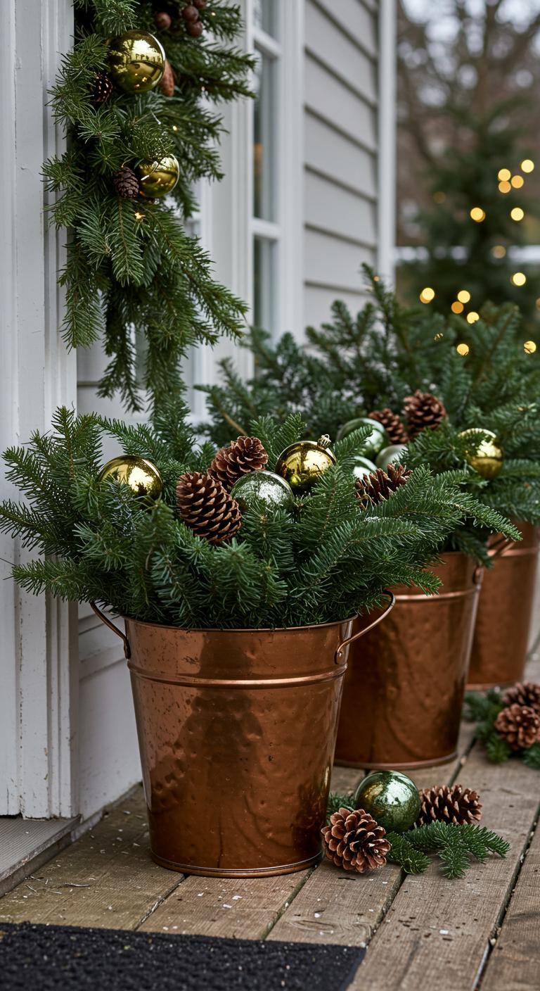 If you tuck gleaming copper buckets by the door, they’ll catch the porch light and elevate simple clippings into a polished rustic display; fill them with fresh fir, pinecones, and a few matte ornaments for contrast.