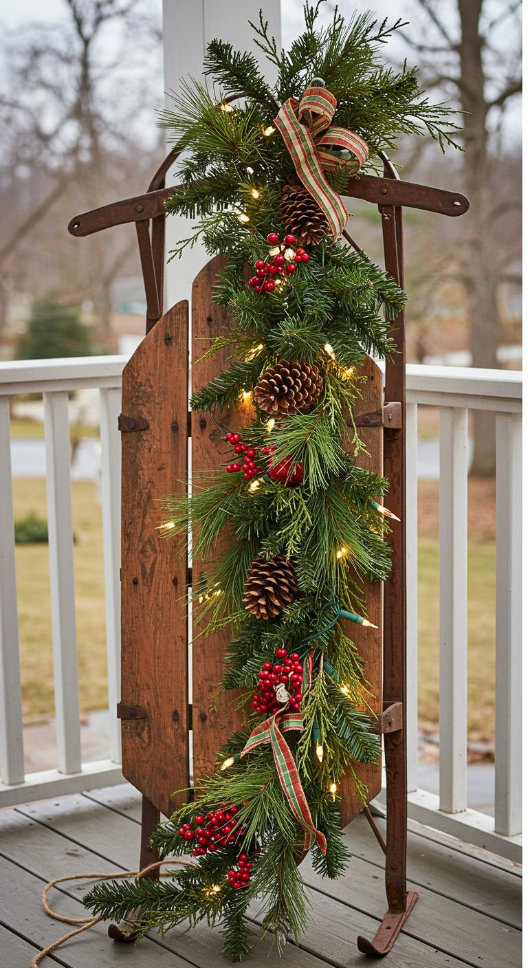 An antique sled leaning against your porch railing becomes an instant focal point when you drape it with a simple evergreen garland; the aged wood and iron runners contrast beautifully with fresh pine, berries, and a smattering of pinecones.