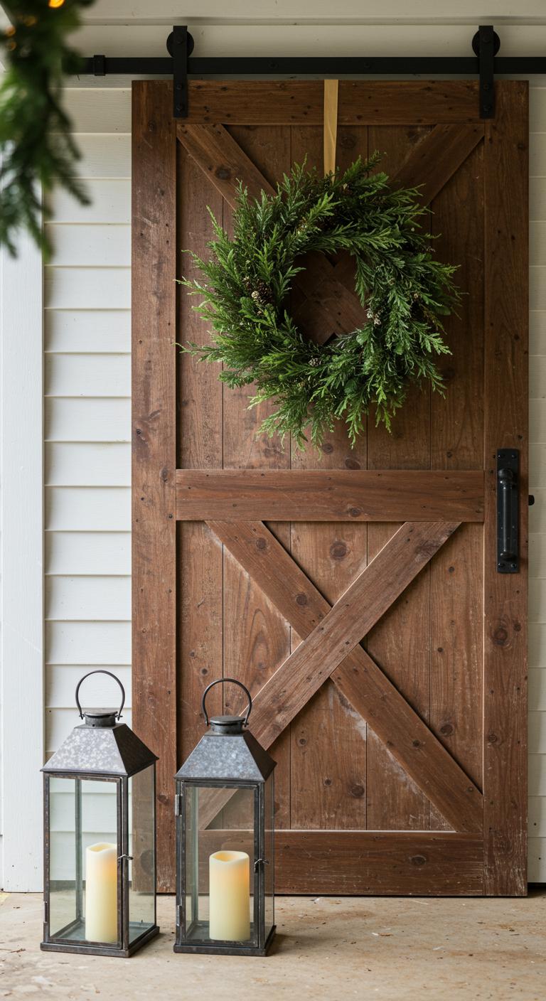 If you want a focal piece that feels both welcoming and lived-in, hang a simple evergreen wreath on a weathered barn door and flank it with metal lanterns holding flickering candles.
