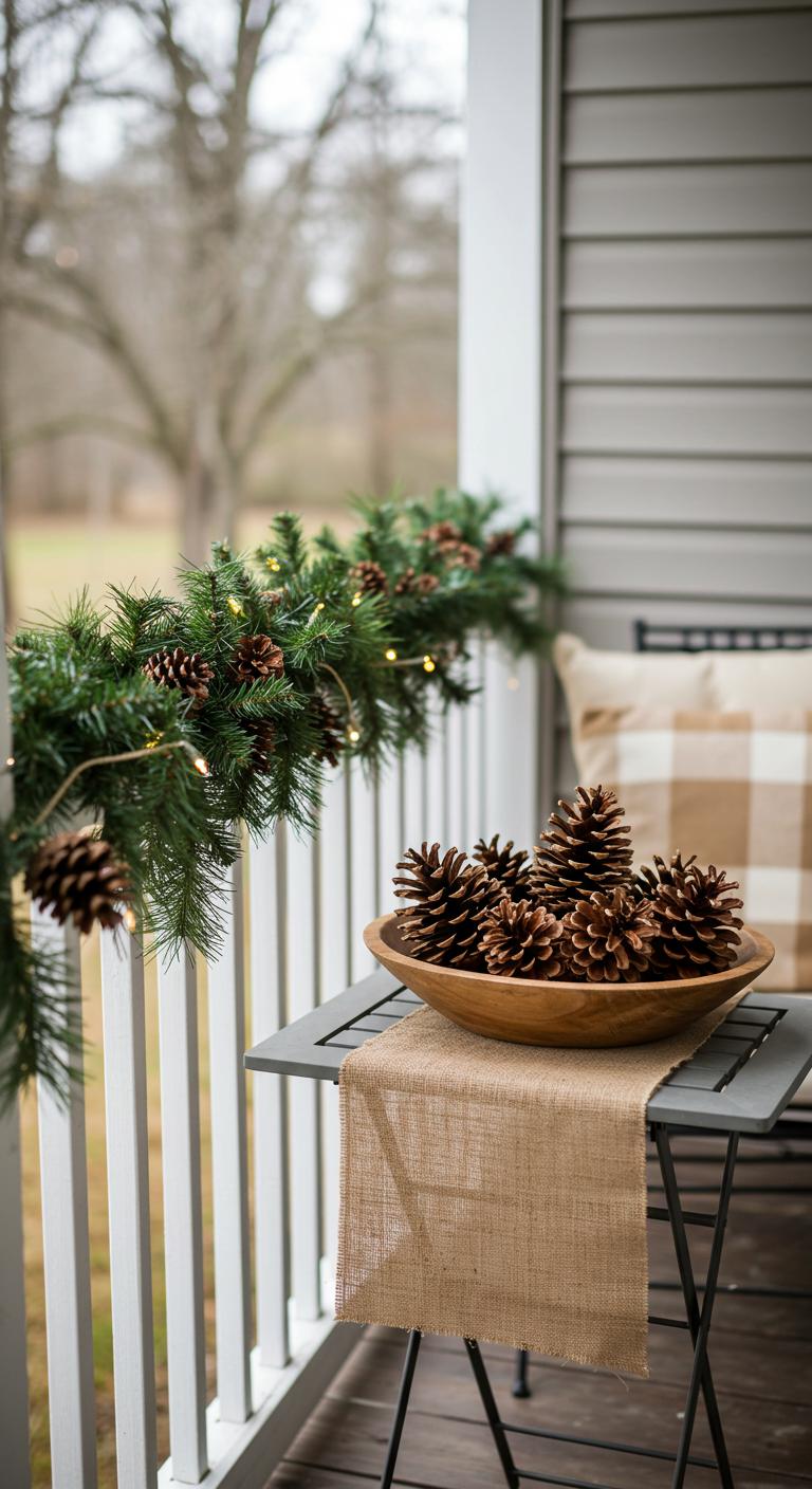 You’ll string a pinecone garland across the railing, cluster cones in a wooden bowl, and lay a burlap table runner on a small side table.