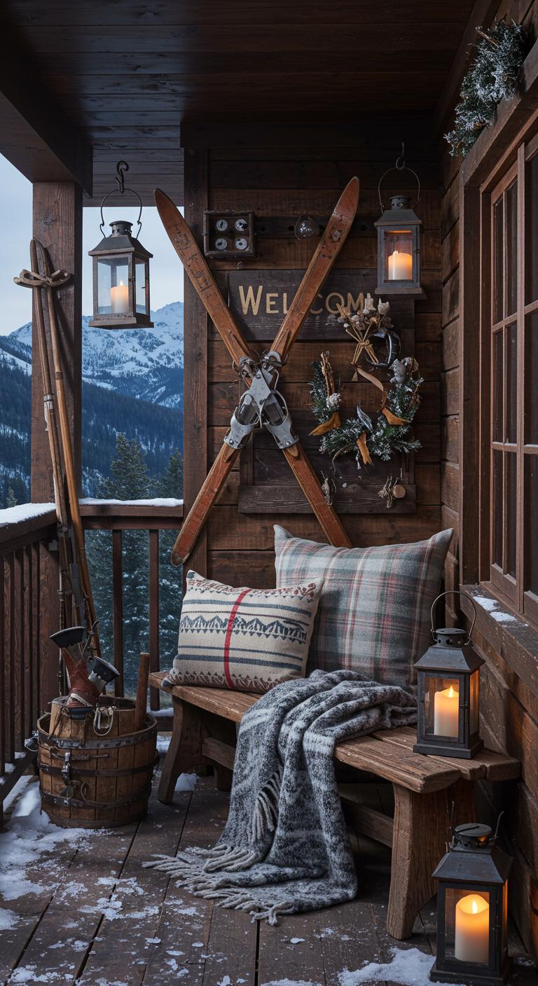 Hang vintage ski equipment as functional hooks, drape wool blankets over a bench, and add lanterns and alpine decorations for warm glow.