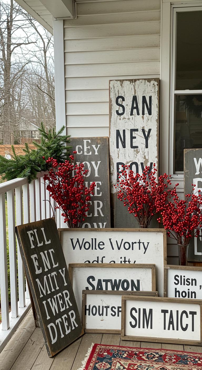 When you pair chipped, sun-faded wood signs with clusters of bright red berries, your porch gains an instantly lived-in, festive personality that feels both rustic and refined.