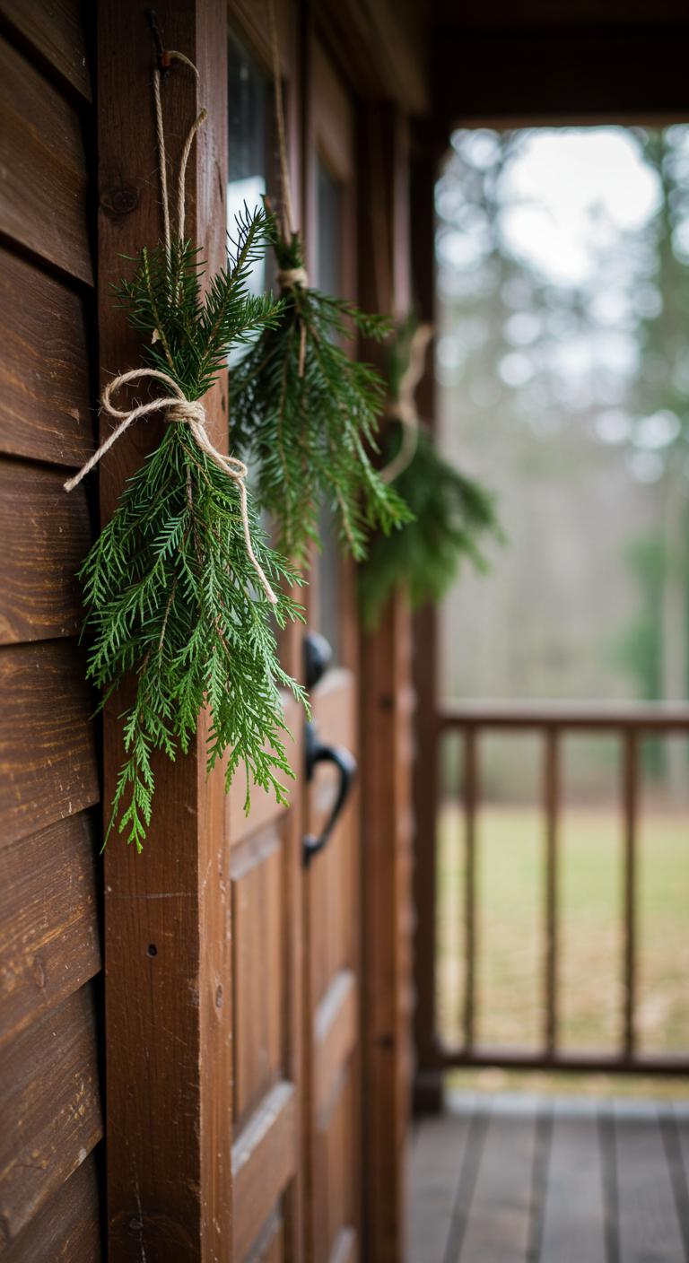 Use twine accents for a minimalist, rugged touch; swap sprig varieties, secure with simple knots, and refresh them easily for a free-spirited, welcoming porch.