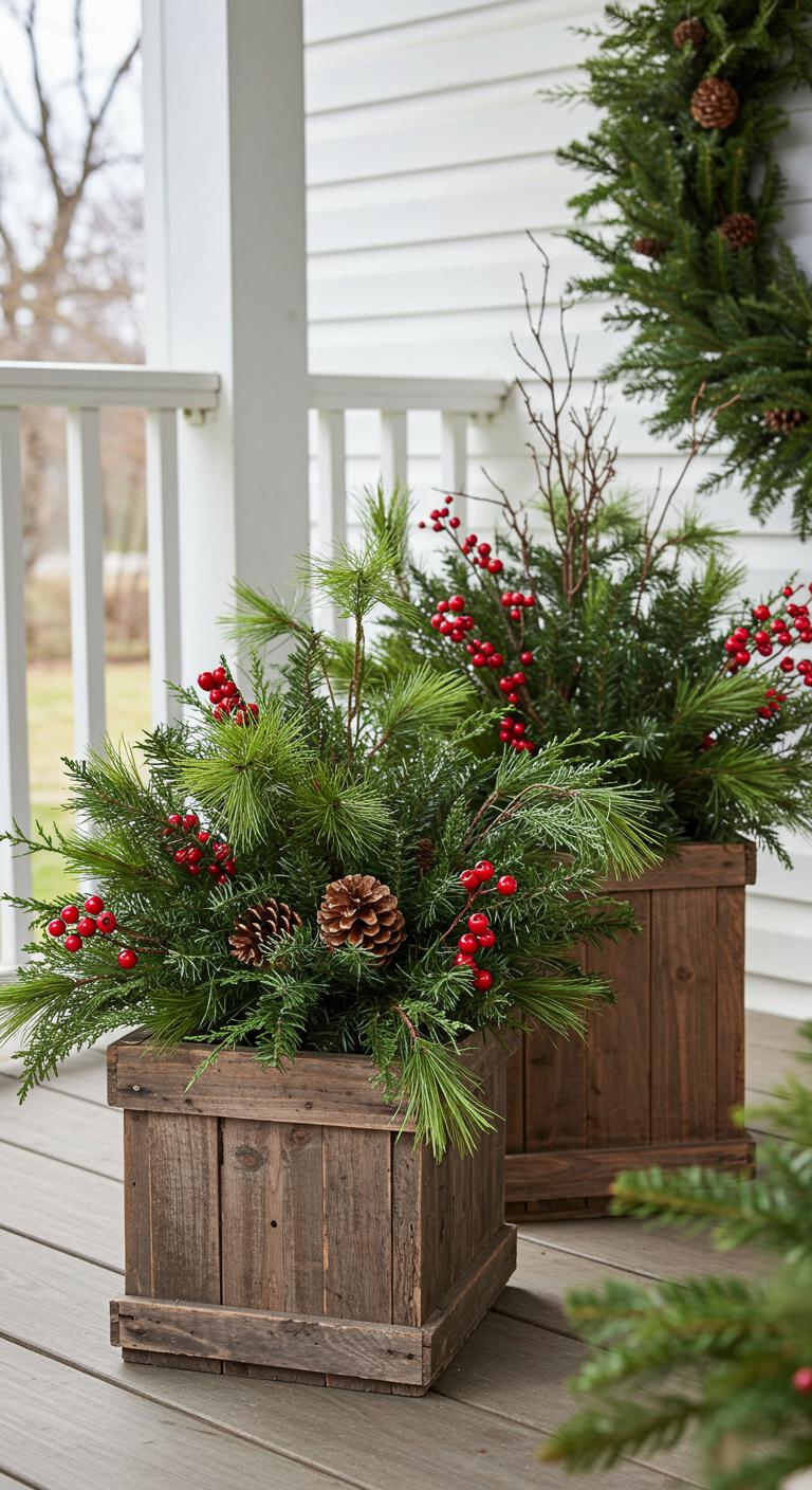 Move the same honest, natural vibe up a level by bringing reclaimed timber planters onto your porch—they pair beautifully with the simple evergreen bunches and twine.