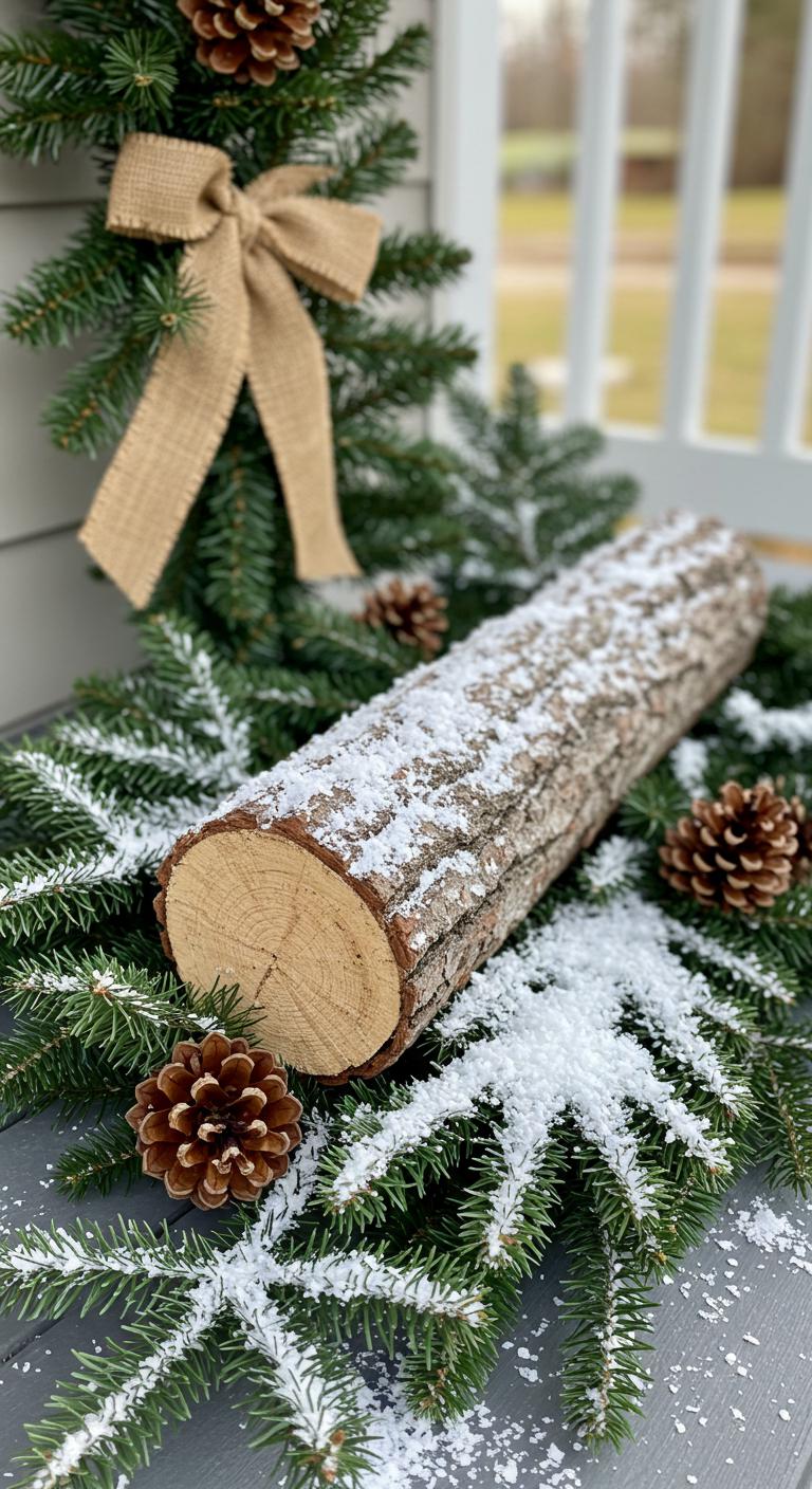 When you tuck a snow-dusted log among a cluster of fresh spruce boughs, your porch instantly feels like a cozy woodland nook; the contrast of rough bark, soft needles, and powdery faux snow creates a simple, natural vignette that’s both striking and low-maintenance.