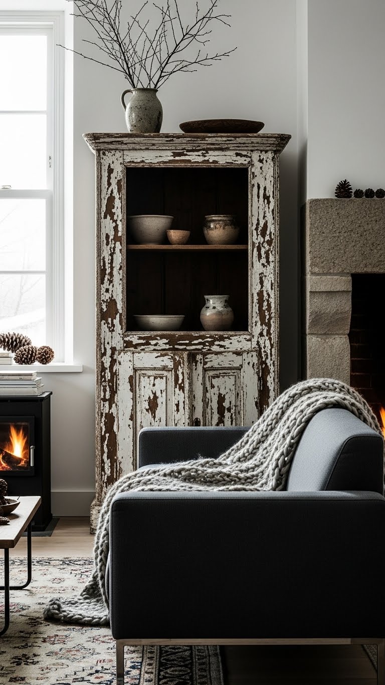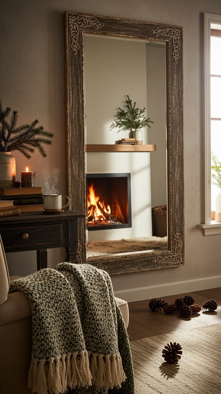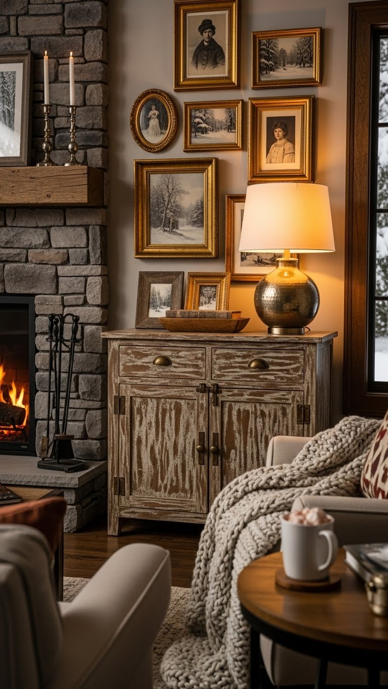 Add big antique items like mirrors. Search thrift stores for deals. Place them as focal points. This personalizes the space. Tip: Polish gently. DIY: Frame photos in old styles. Position pieces on walls. For example, above the fire. Keep them central. Your room tells your story.