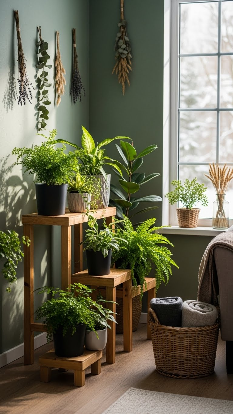 Bring in plants and natural bits to connect with the outdoors. Start small: Place a houseplant on your coffee table. Use cuttings from your garden for arrangements. This makes the room feel alive. Tip: Water plants from your kitchen sink. DIY idea: Make a wall hanger from twigs and string. Keep pots simple and scattered. For example, add dried flowers in a jar. Save money by propagating from friends. Focus on corners that need life. Your space will feel calmer and greener.