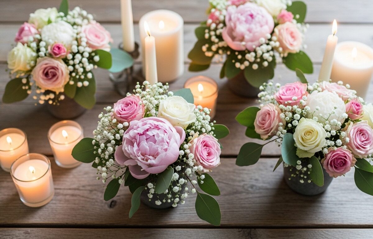 Okay, real talk – start by foraging your own yard or hitting the discount flower bin at the grocery store; baby’s breath is cheap and lasts forever, plus it gives that perfect “in bloom” fluff without fuss. Layer your bases like wood slices or thrifted jars to add texture – I always mix three heights for visual pop, and trust me, it tricks the eye into thinking it’s pro-level. Then, play with lighting: fairy lights or candles make everything cozier, especially at night; just scatter ’em loosely so it feels natural, not staged. Oh, and pro tip from my trial-and-error parties – mist the flowers daily to keep ’em perky, saves you from wilted disasters.