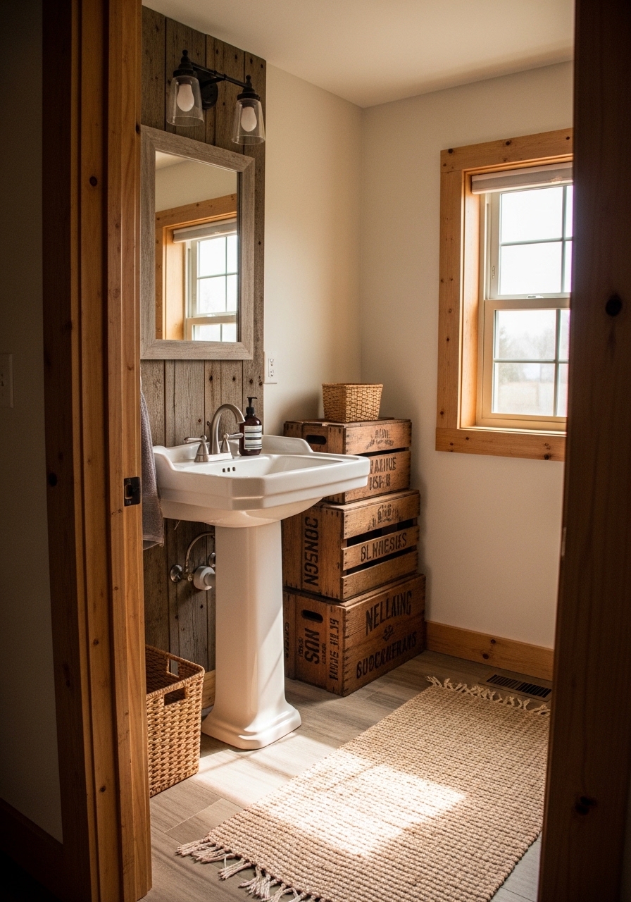 Using old crates as stacked storage is brilliant for budget farmhouse vibes – I painted mine white and lined them with fabric scraps for a custom feel. You can tuck them in a corner for holding towels or soaps, maximizing every inch. My neighbor saw mine and copied it; now her tiny bath has that charming, organized edge without buying fancy cabinets.