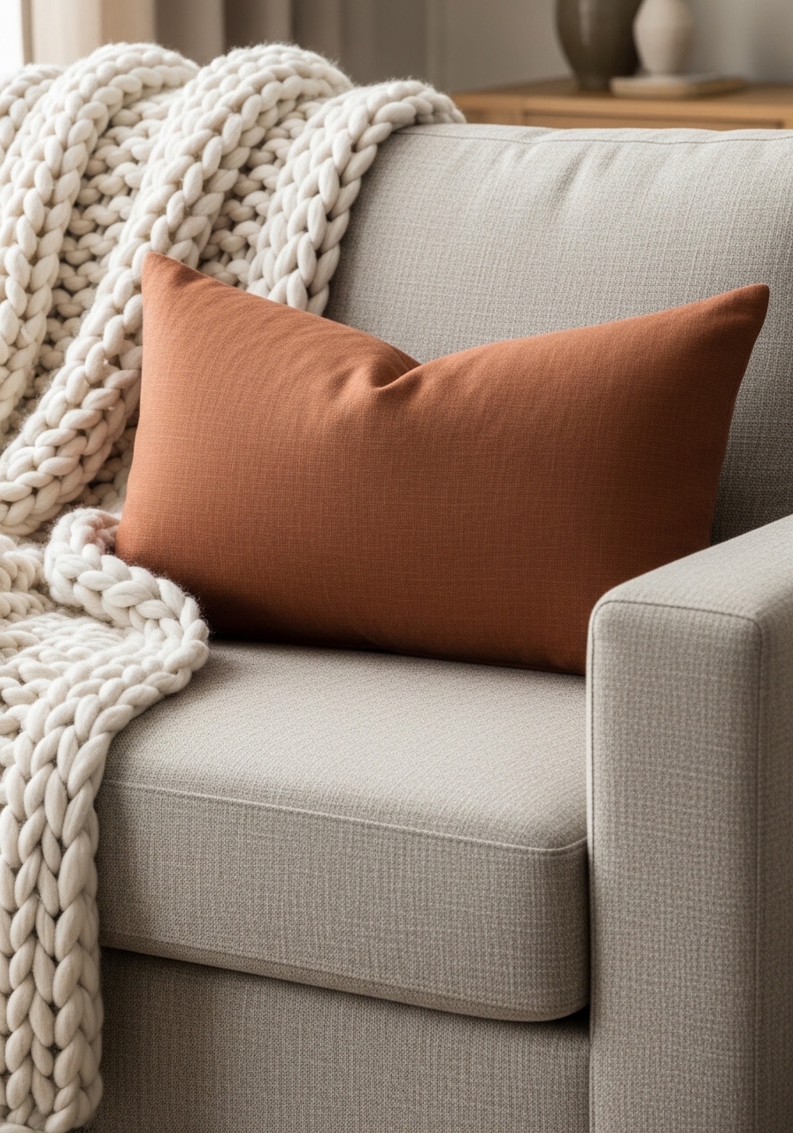 I layered beige, warm white, and soft gray. Then I added a single rust pillow for a focal point. It reads calm and intentional. I used cream chunky knit throw (50×60") and rust lumbar pillow cover. Styling tip: stick to three colors max. Mistake to avoid: too many competing accents; it looks cluttered.