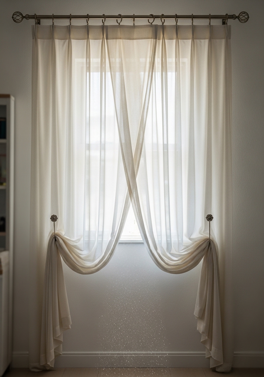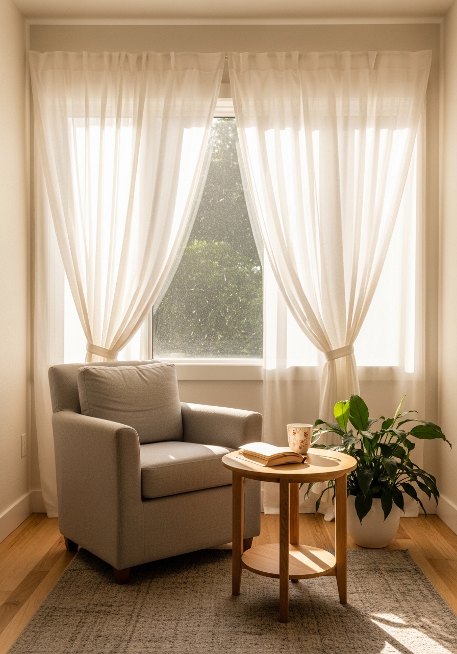 Sheer panels soften light and keep privacy. I used 96" panels in light ivory. I linked sheer curtain panels 96 inch and curtain rod 48 inch. Tip: layer with blackout liners for night. Mistake: heavy drapes during the day that darken rooms.