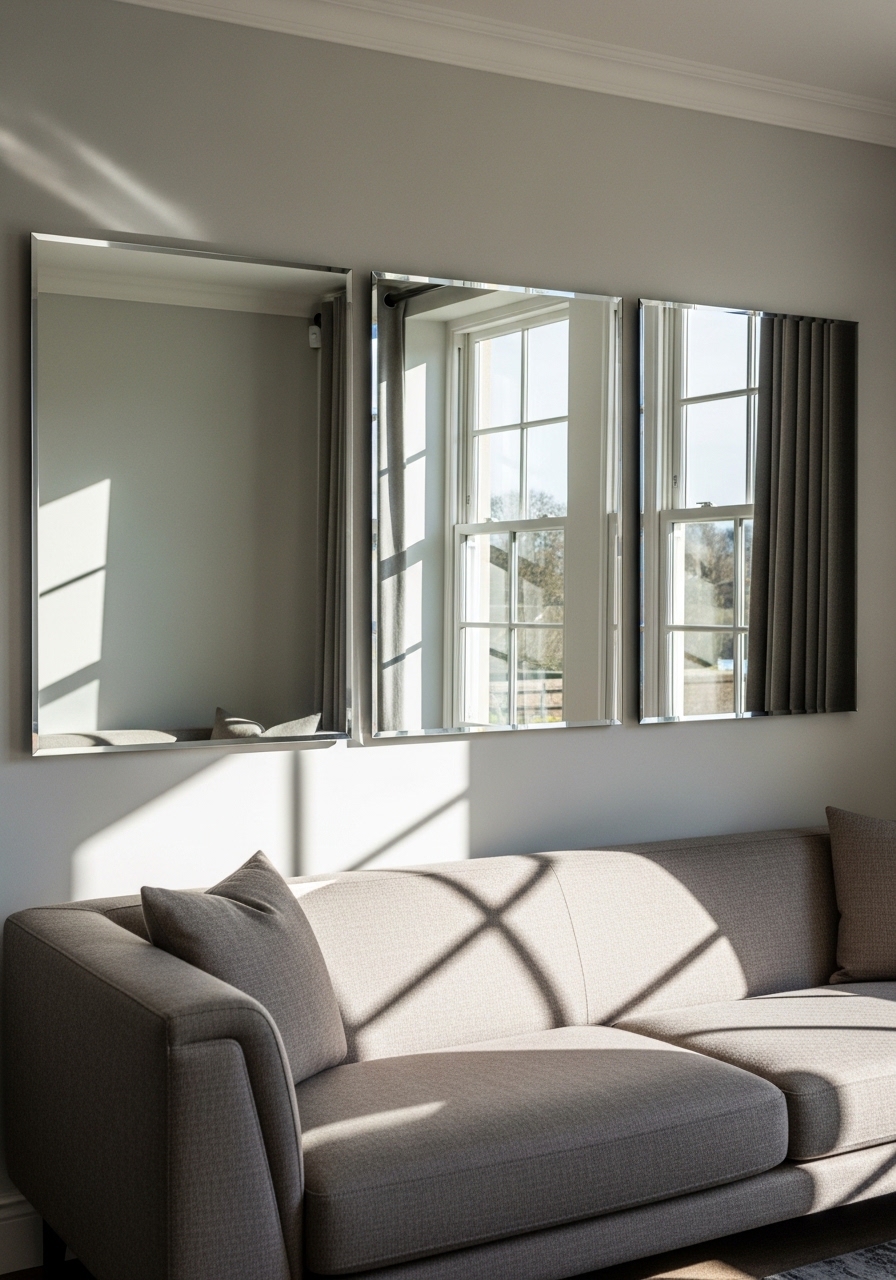 I added three slim mirrored panels opposite the window. They multiply daylight and double perceived space. I used rectangular mirror panels (16×40") and mirror mounting strips. Tip: stagger heights slightly for interest. Mistake: mirror placement that reflects a messy corner.