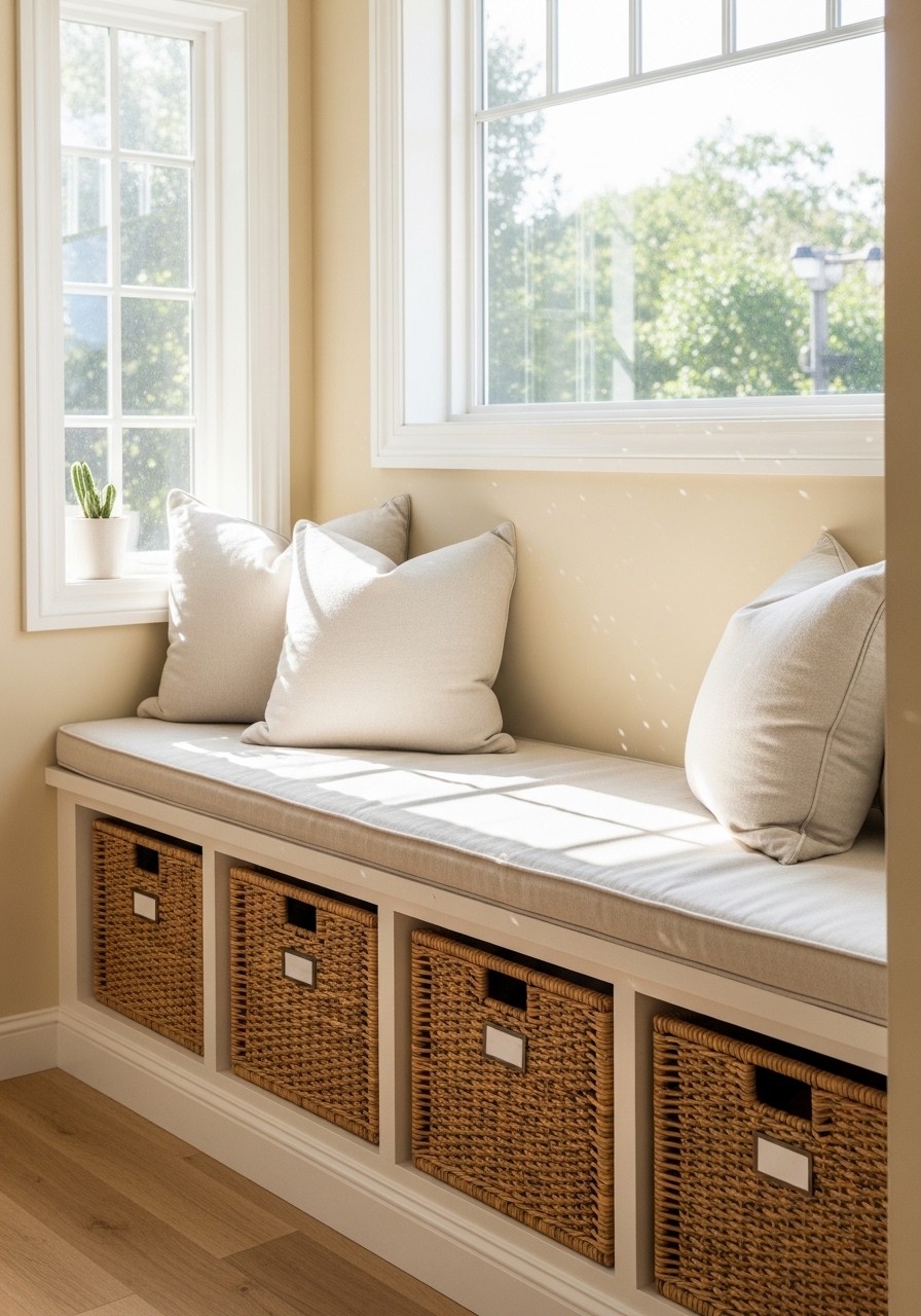 I made a bench with storage baskets below. It fits a 48–60" window. I recommend storage bench cushion 48in and woven storage baskets. Tip: add a thin bolster for back support. Mistake: seating too deep for short windows.