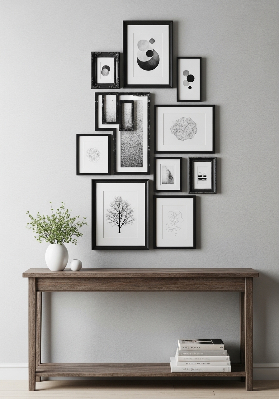 I went vertical with 5 narrow frames to draw the eye up. Frames are 8×10 and 11×14. I used black 8×10 frames and gallery hanging kit. Tip: keep consistent mat color. Mistake: mixing too many frame colors.