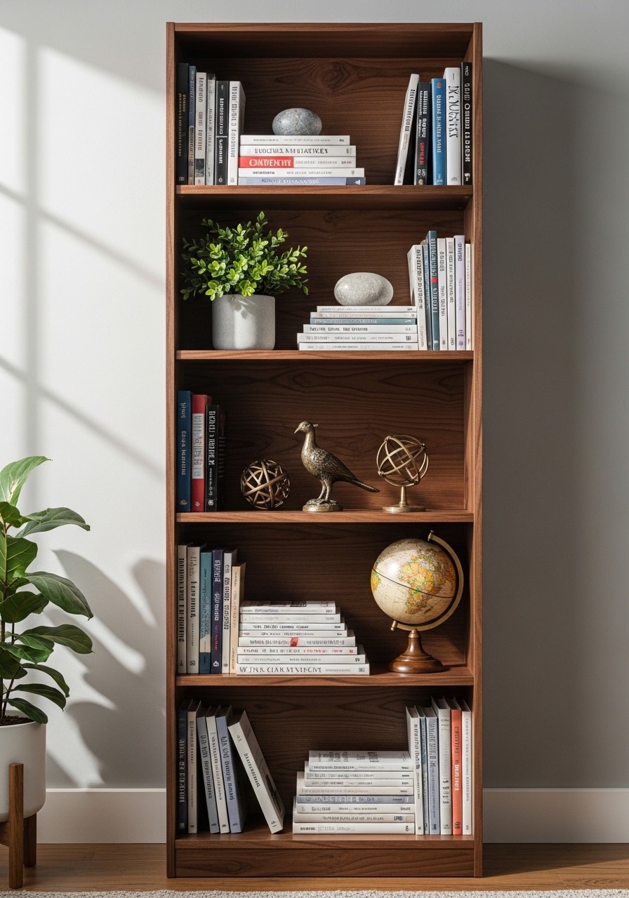 I kept shelves sparse—books, one plant, and a sculpture per shelf. I used narrow bookcase 24 inch and bookends set. Tip: leave one-third of each shelf empty. Mistake: packing shelves wall-to-wall.