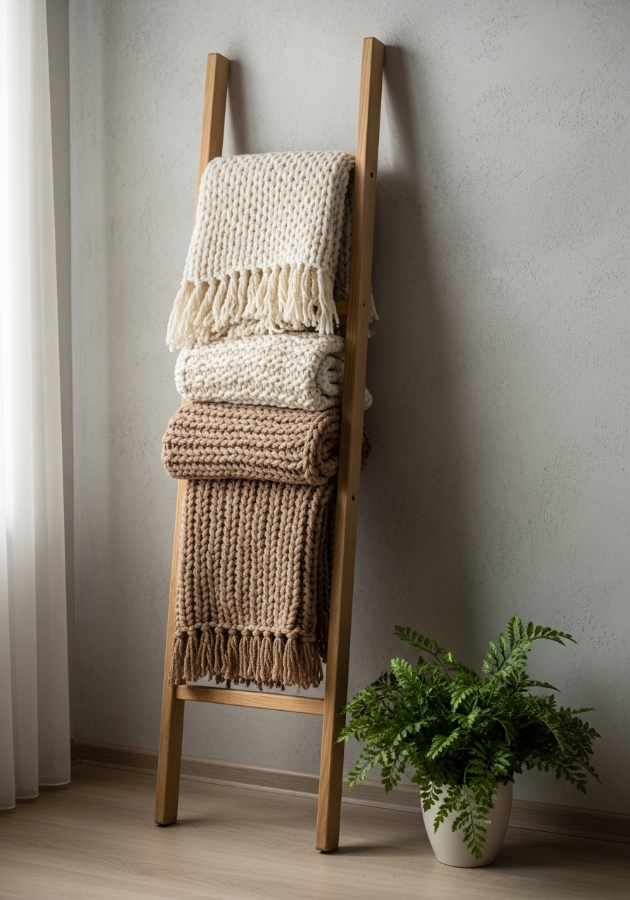 A 60–72" leaning ladder stores throws vertically. It reads decorative and useful. I used leaning ladder 60 inch and cotton throws 50×60. Tip: fold throws uniformly. Mistake: overcrowding the ladder with small items.