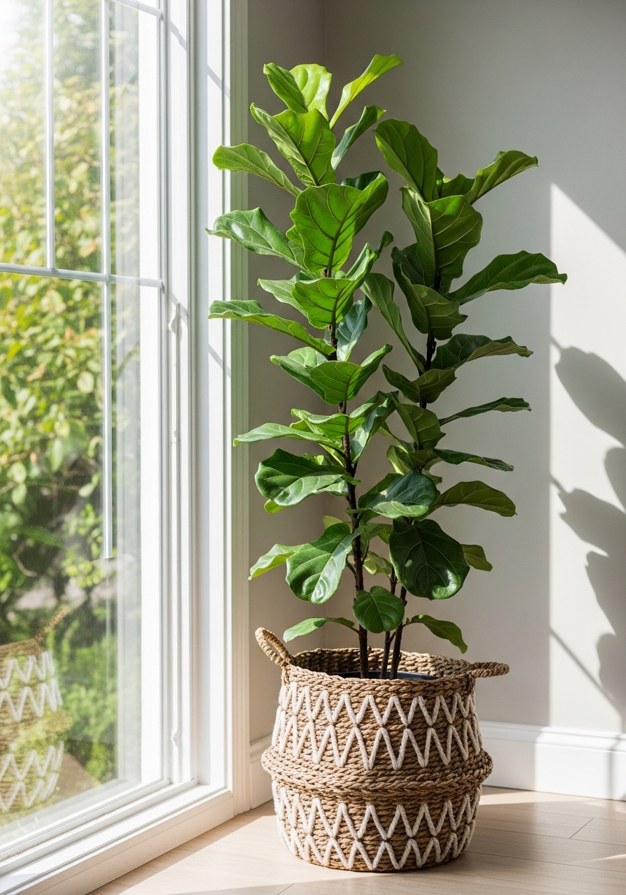 A single 6-foot fiddle leaf fig gives height and drama. I bought 6-foot fiddle leaf fig tree and woven plant basket 12 inch. Tip: place near light. Mistake: crowding a tall plant into tiny dark corners.
