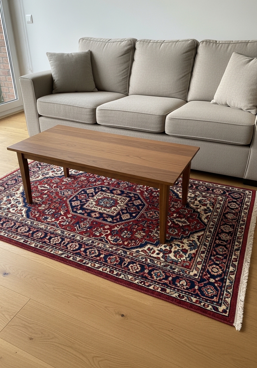 A pale 6×9 or 8×10 rug visually expands the floor. I used 8×10 jute rug. Tip: pull at least the front legs of seating onto the rug. Mistake: small 4×6 rugs that float awkwardly.