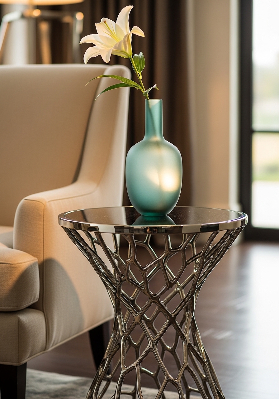 A sculptural side table reads like art and saves space. My 14" diameter metal table fits any nook. I linked 14 inch side table and small vase 8 inch. Tip: keep top styling minimal. Mistake: choosing a wobbly, unstable table.