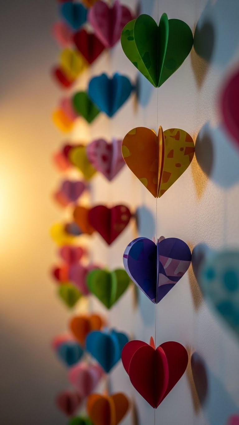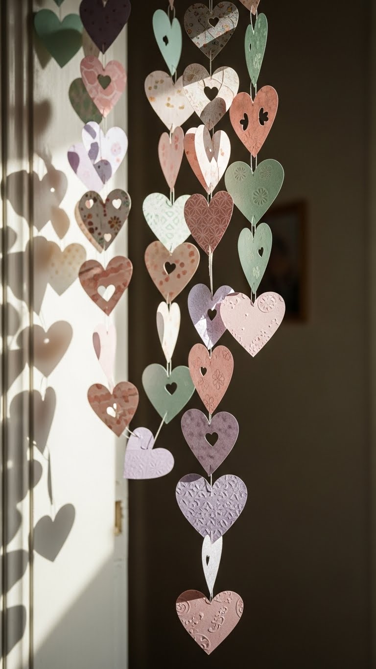 Make paper heart chains. Cut and link hearts. Hang in doorways. Great for kids’ rooms. Cost? Nothing if using scrap paper. Loop them up high. They add playfulness. Take them down easily.