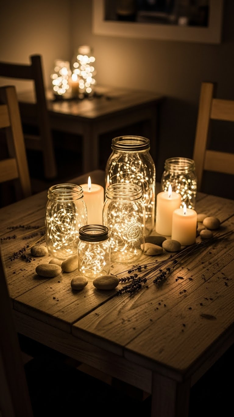Turn mason jars into lanterns easily. Find jars in your kitchen or buy cheap ones. Add fairy lights inside. Set on tables or mantels. This creates a soft glow in small areas. Use what you have for free. For example, wrap jars with twine for extra style. Lights cost about $3 from a dollar store. Arrange a few for a romantic vibe. They fit on tiny surfaces. Switch them on at night. Your space will feel warmer instantly. Give it a try tonight.