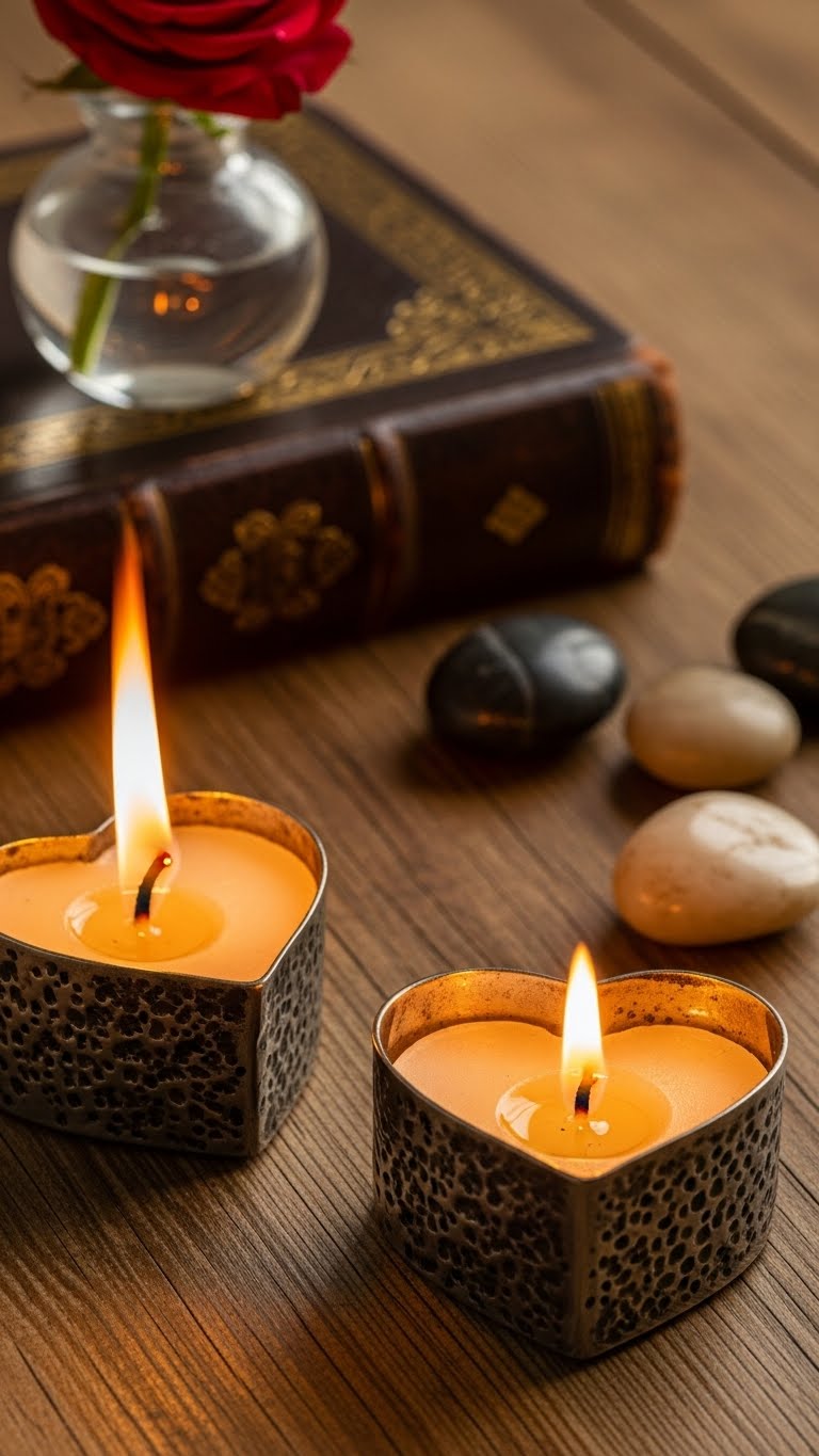 Scatter heart-shaped candle holders around. Buy affordable ones or make from clay at home. Place tea lights inside. Put them on tables for a warm effect. This suits small apartments perfectly. DIY tip: Use old jars and draw hearts on them. Total cost under $4. Light them up in the evening. They create a relaxing atmosphere. Arrange in groups for balance. Blow them out safely. It’s an easy way to set the mood.