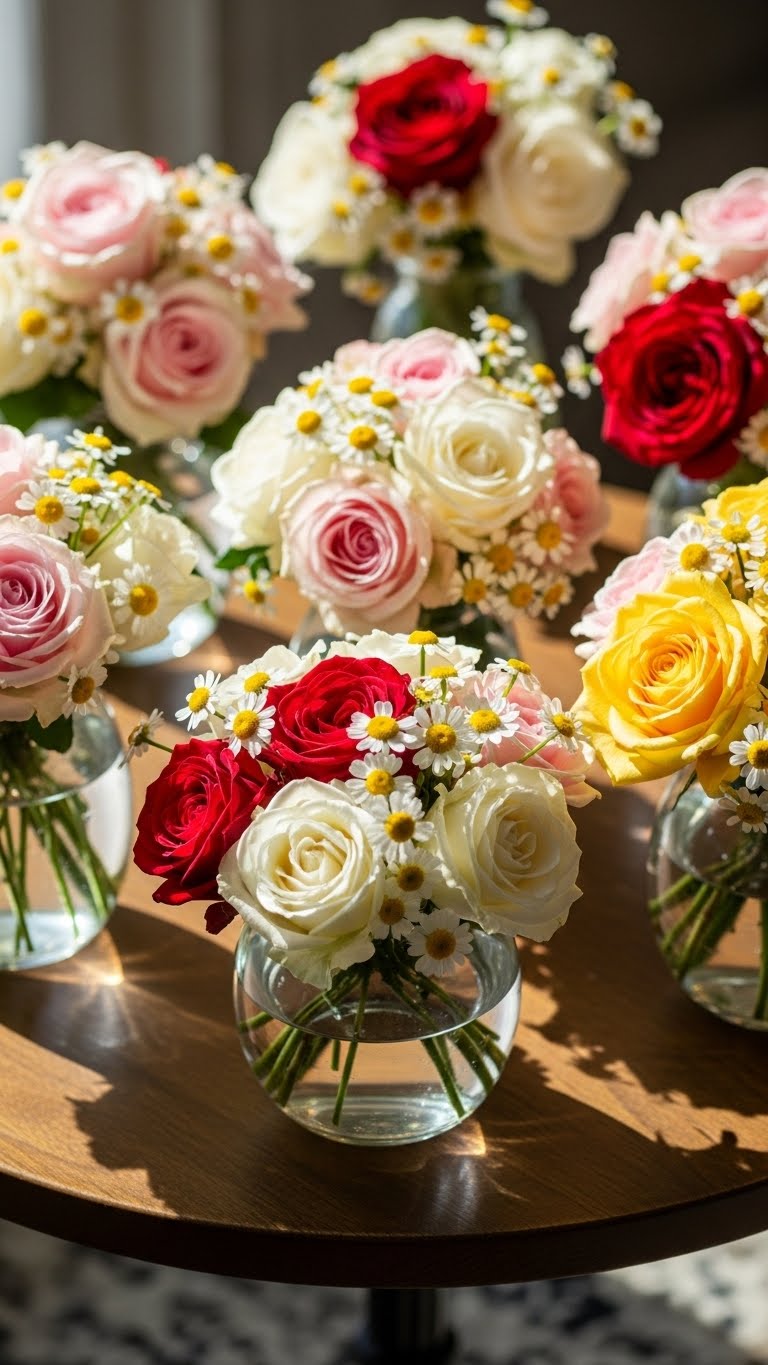 Build mini bouquets with fresh or fake flowers. Pick roses and daisies from a store. Wrap stems in paper or twine. Set on tables as sweet accents. This fits tiny spaces like counters. Budget idea: Use wildflowers from outside. Spend less than $2 per bunch. Place in small vases you already own. Refresh water daily if fresh. They add color without clutter. Try mixing with greenery. Your table will pop with charm.