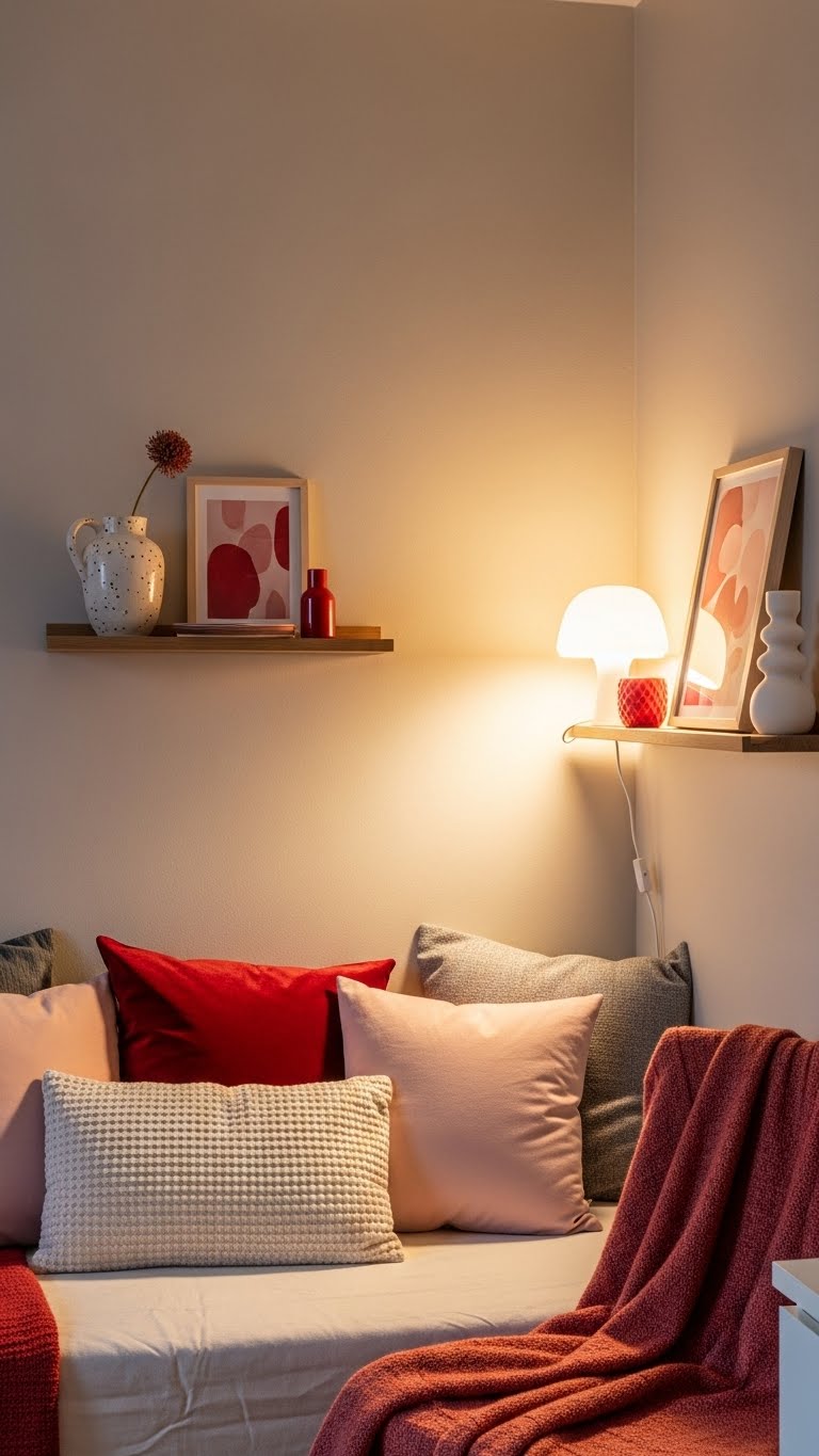 Mix red and pink into your decor. Add throw pillows or blankets in these hues. Pair with neutral walls for balance. This works in living rooms or bedrooms. DIY: Tie fabric scraps into bows. Cost? About $3 for pillows from a thrift shop. Layer on sofas for comfort. Use sparingly to avoid overwhelm. Change them out easily. Your space will feel lively. Experiment with shades you like.