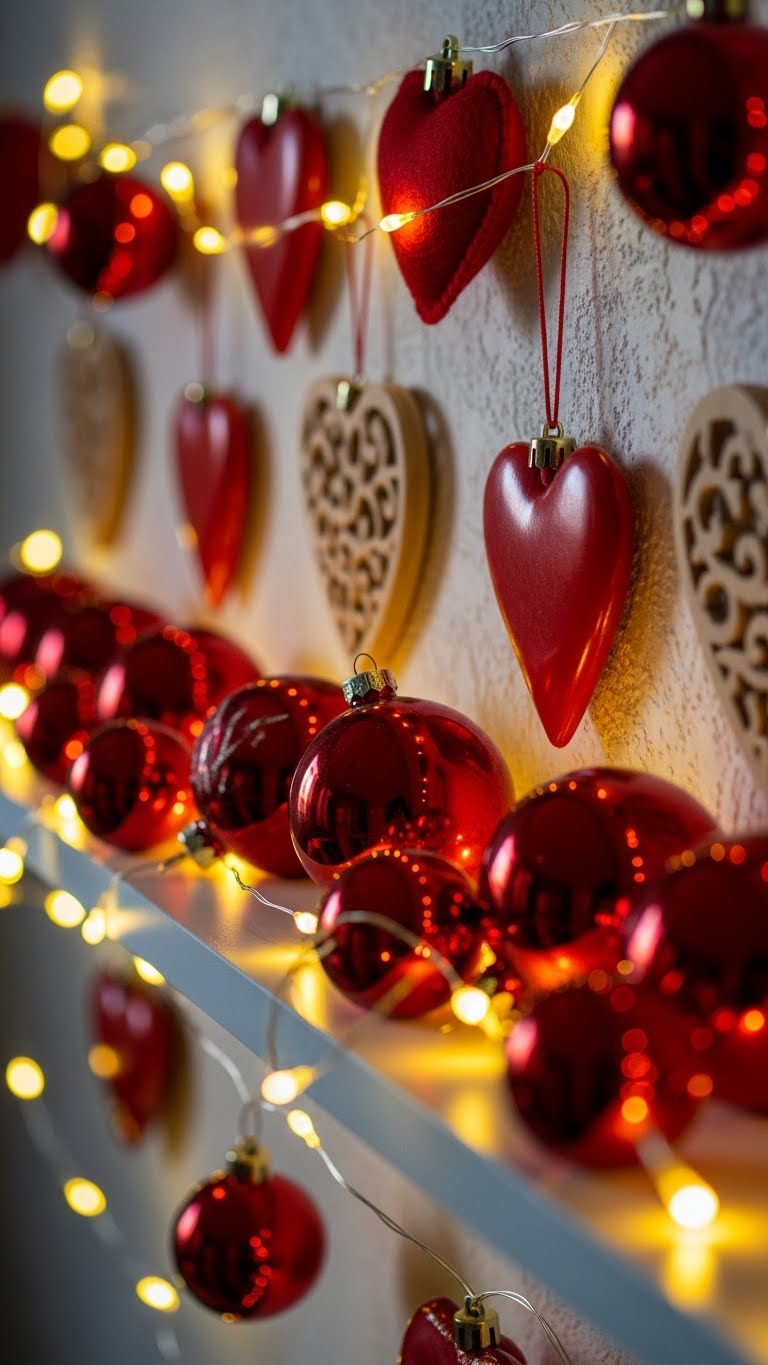 Repurpose old Christmas items for this holiday. Take red balls or lights from storage. Turn them into heart displays. Hang on walls or shelves. Perfect for budget setups in apartments. No new buys needed. For example, add hearts cut from paper. Save money by reusing. Set up in minutes. It keeps things fresh. Your decor will look thoughtful. Store extras for next time.