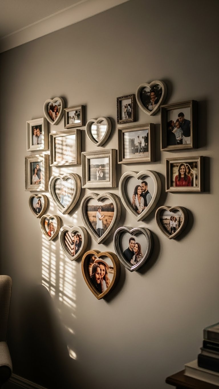 Create a photo wall with couple pics. Print photos and frame in hearts. Hang on empty walls. Ideal for studios. DIY: Use string and clips for easy setup. Spend $2 on prints. Group them for impact. It adds personal stories. Change photos anytime. Your wall will tell a tale.