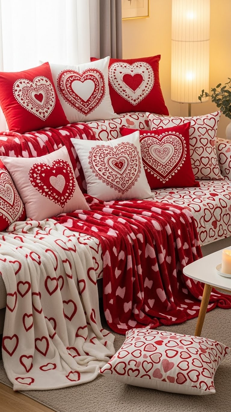 Swap in heart pillows and blankets. Place on your sofa. They bring color to living rooms. Pick from thrift stores. Cost? Around $4. Layer for coziness. DIY: Sew hearts on plain ones. Relax and unwind. Your room will invite snuggles.