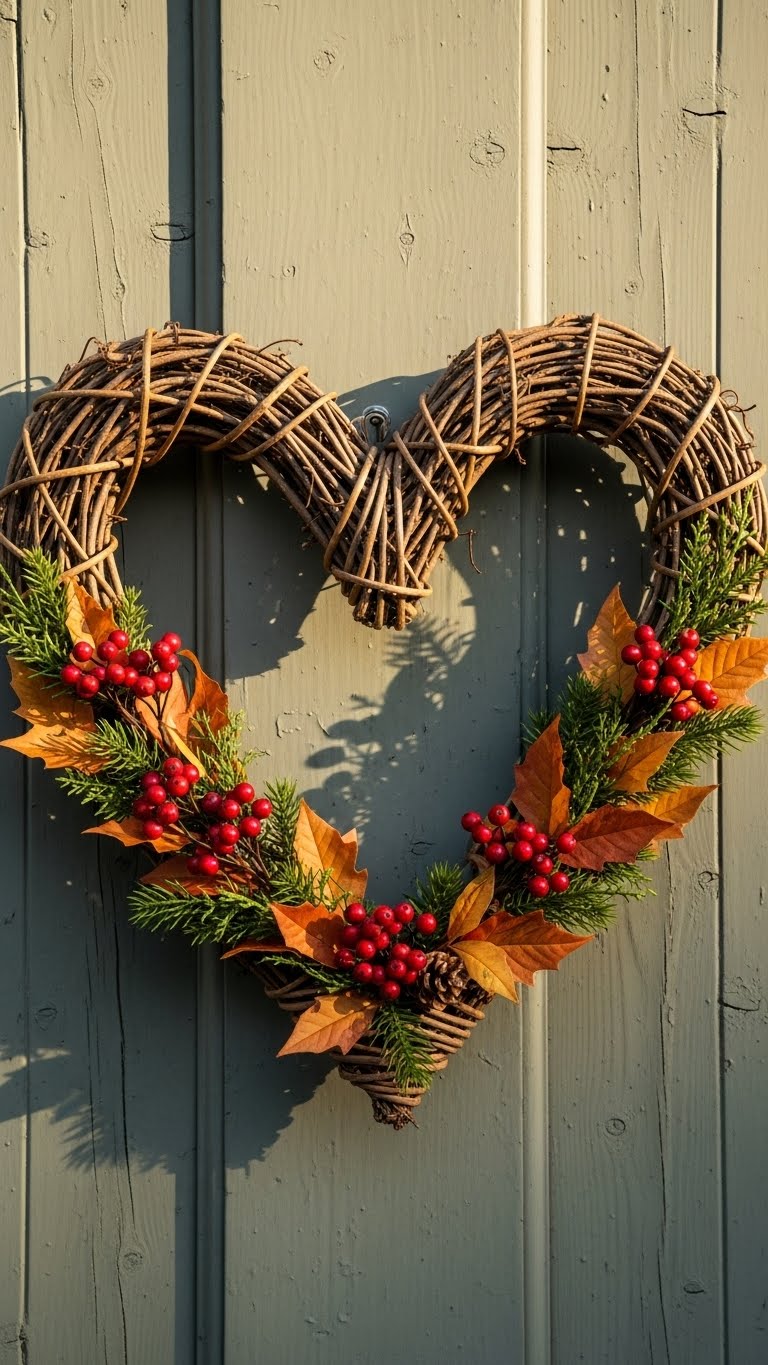 Hang a simple wreath on your door. Use grapevine or paper. Add hearts for flair. Fits entryways. Buy for $3 or make one. Tie it securely. Welcome guests warmly.