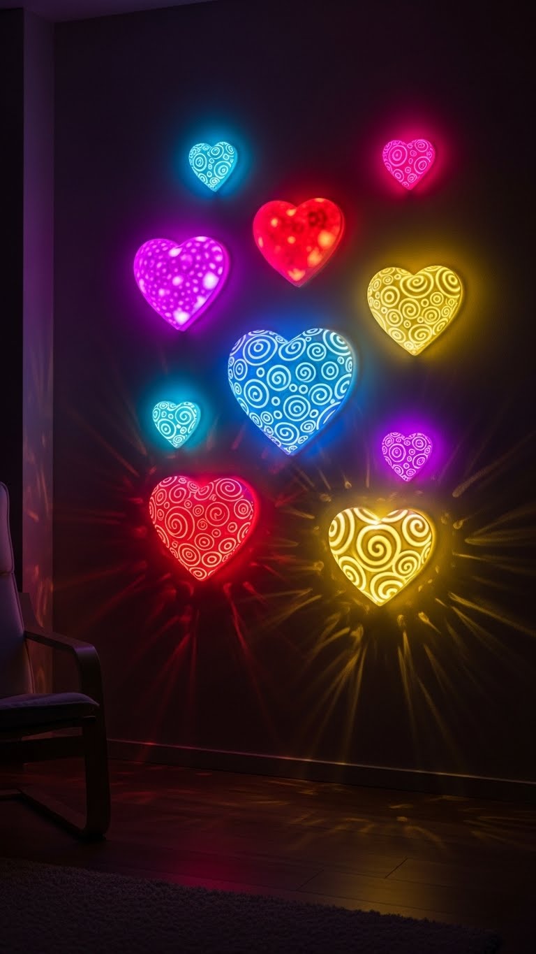 Add LED heart lights. Stick on walls. They modernize studios. Cost? $5 online. Plug in and adjust. DIY: Arrange in patterns. Your space lights up fun.