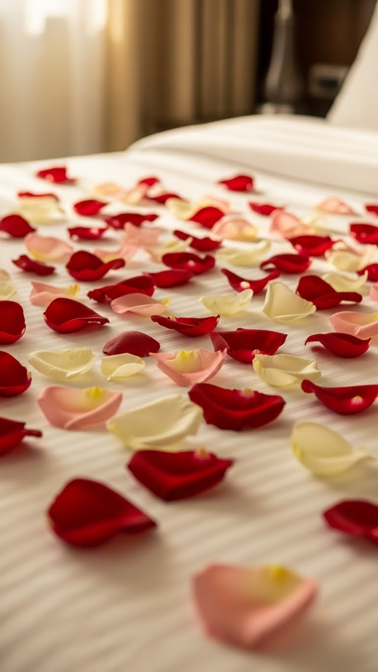 Scatter rose petals on beds. Use real or fake ones. Add intimacy quickly. Budget: $1 for petals. Arrange artfully. Make nights special.