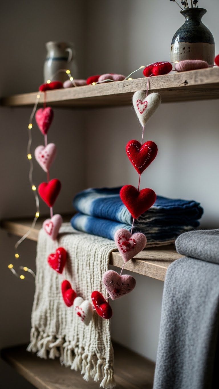 Craft felt garlands. Cut felt hearts. Hang on shelves. Easy for any room. Cost? Under $2. Layer with books. It adds softness.
