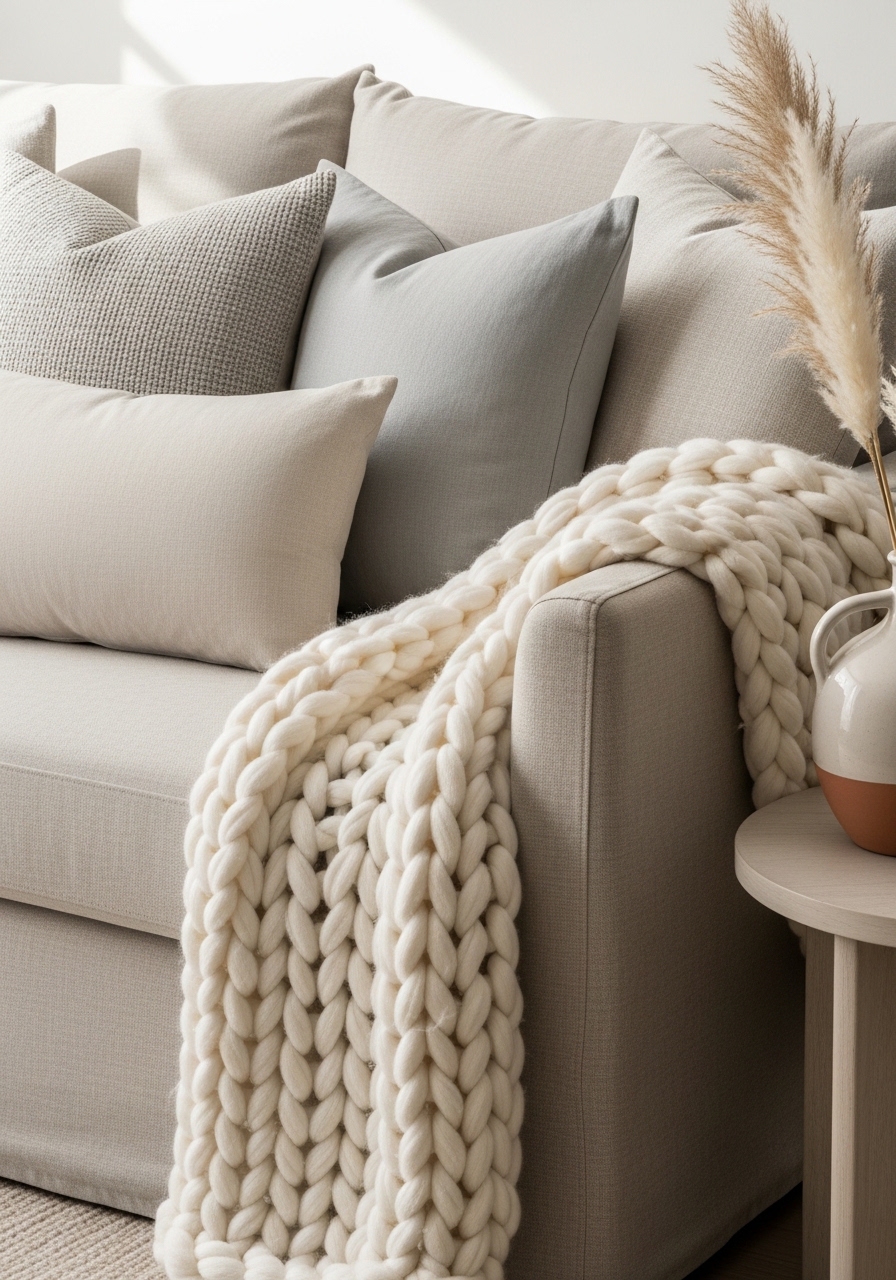 I love one soft color against warm neutrals — a muted sage pillow or a soft terracotta vase. I paired velvet pillow covers with a chunky knit throw. The rule of 3 textures (linen, velvet, knit) keeps this from reading flat. Use a 2:1 texture ratio — two soft fabrics, one natural fiber. Avoid using too many bright accents; one muted color keeps the room calm.