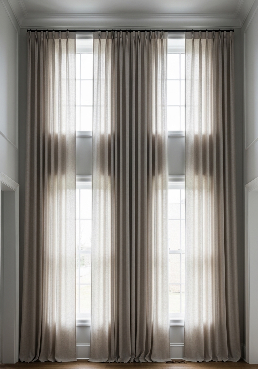 - Curtains should hit the floor: Use 96-inch panels for 8–9-ft ceilings.
