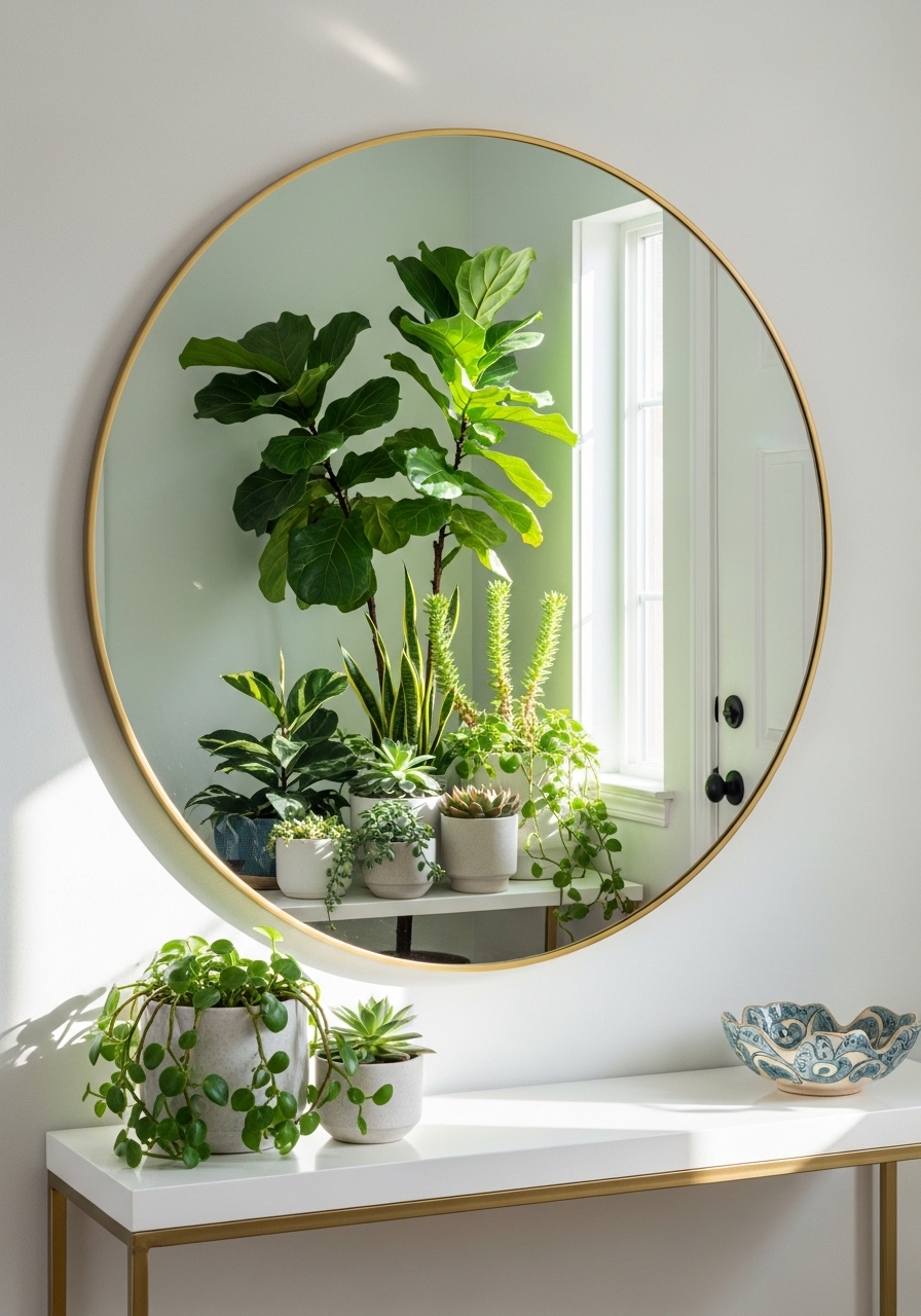 I leaned this 36-inch round mirror on the console. It bounces light and creates depth. Pair with a small ceramic vase and a stack of books. Avoid hanging it too high; the mirror should reflect eye-level and the room’s best feature.