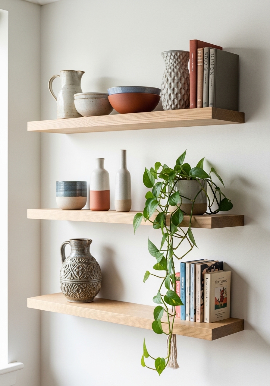 I installed white oak floating shelves and styled them with odd-numbered groupings: 3 ceramics, 2 books, 1 trailing plant. I use a macrame plant hanger to break linear lines. Mistake: overcrowding. Leave breathing room so each piece reads.