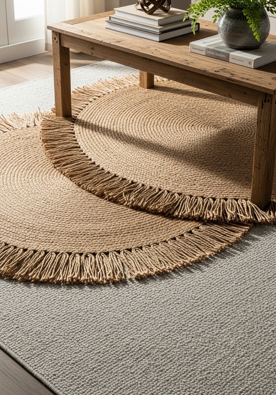 A round jute rug anchors my seating area and adds natural warmth. Layer with a flatweave underlay for comfort. For small rooms, choose a rug that allows front legs of furniture on the rug. Mistake: picking a rug too small — it fragments the space.